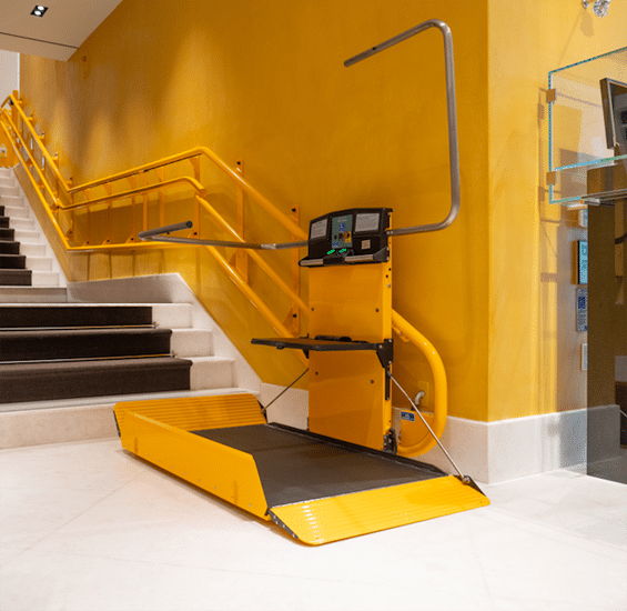As the name suggests, vertical platform lifts use a platform to raise or lower the user between floors. Although this lift functions similarly to an elevator, this type of installation requires less space and most applications are less costly than a traditional elevator. Like inclined wheelchair lifts, vertical platform lifts can be used inside and outside of buildings. Commercial vertical platform lifts can be customized to add additional enclosure and security, depending on your building’s space and the needs of your guests, employees, or clients.
