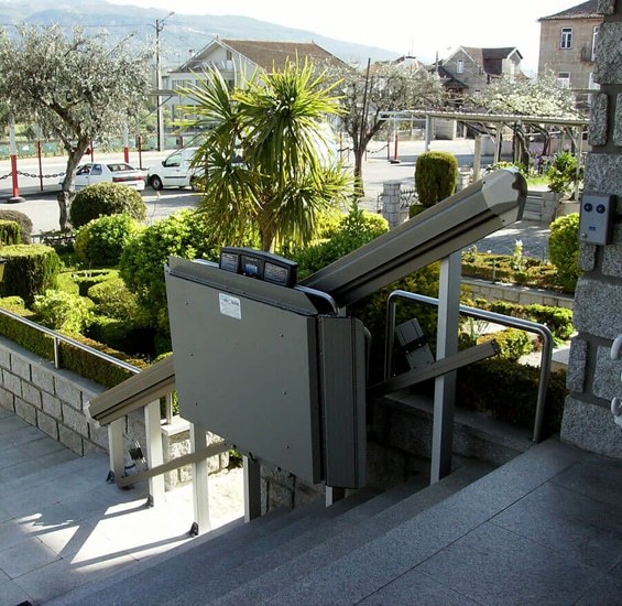 Our selection of inclined platform lifts can be used in indoor and outdoor commercial settings. These types of lifts carry passengers up and down both straight and curved staircases, making them a versatile option for many commercial or public buildings. Inclined wheelchair lifts carry passengers on a level platform that’s placed above the existing staircase. When not in use, they can be folded to allow for maximum usable space. Inclined commercial wheelchair lifts don’t require an elevator hoistway or vertical platform lift, which can help cut construction costs.
